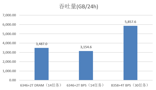 使用每天每台服务器封装的P1容量大小进行3个方案横向比较,2T DRAM方案的每天P1封装吞吐量为(24h*60/370分钟)*64GB=3487GB, 2T BPS方案的每天P1封装吞吐量为(24h*60/409分钟)*64GB=3154.6GB,4T BPS方案的每天P1封装吞吐量为(24h*60/472分钟)*64GB=5,857.6GB。