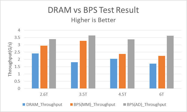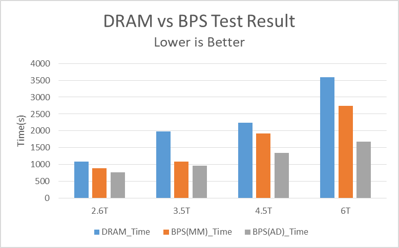 图3、图4是在DFSIO测试模型下,DRAM和BPS的memory/AD 的性能对比图。可以看到,BPS AD模式在高负载下表现出来的吞吐量达到DRAM的2倍,执行时间却只有DRAM的48%,随着负载的增加,BPS的性能显著提高。