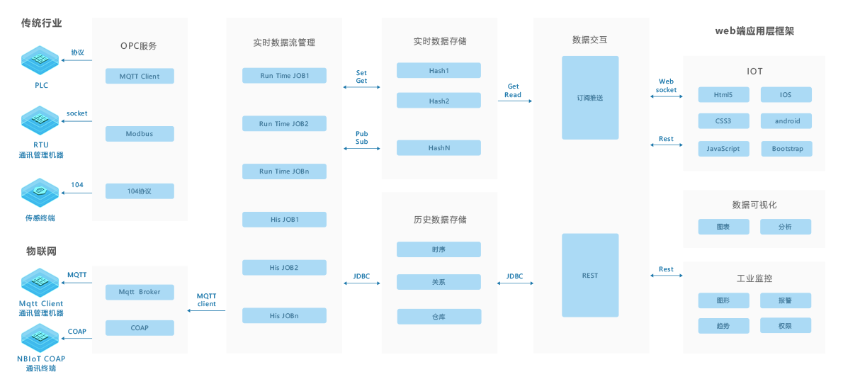 所谓变电站智能集控运维即对变电站进行智能化改造,将站内设备信号接至后台监控系统,实现对站内设备运行情况365*24小时监控,在设备出现问题之前及时报警,并有效消除隐患的维护方式,无人值守的智能站维护模式也是今后电力维护市场的开展趋势。变电站智能集控运维解决方案技术架构如图 1) 传输层-物联网标准采集协议 无需架设VPN,对数据可给予加密 给予各种语言客户端(C,Java,Ruby,Python 等等),方便第三方设备接入 可支持数百万设备连接,可做到物物互联,有利于业务整合,多业务联动 由9001cc 以诚为本 9001cc工业互联网平台给予物联网服务支撑 2) 平台层-数据流处理引擎 平台采用基于9001cc 以诚为本 9001cc工业互联网平台的数据流处理引擎。该引擎在分布式(集群)的流数据处理的基础上给予数据分发、研讨、以及容错的功能,把纯流式数据计算引入大数据时代。具有高吞吐、低延迟、高可靠和精确计算等特性 3) 平台层-实时数据存储 实时数据存储数据库的单节点版本已经在商品机器上超过100亿行高压测试,而插入性能没有损失。支持高达每秒百万级的写入能力,支持毫秒级精度的数据存储,不需要降精度也可以永久保存数据 4) 应用层-H5+CSS3+JS 充分利用H5前端框架更快的加载速度与展示效果,为移动应用的普及推广打下良好的基础