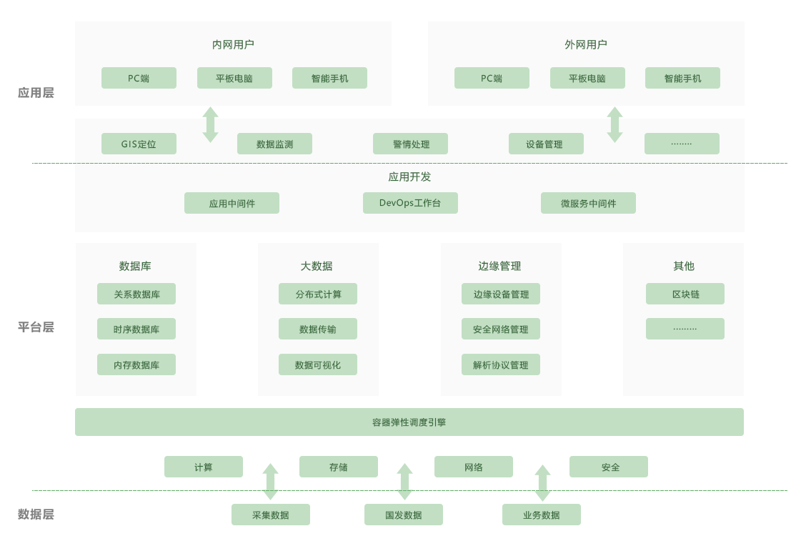 数据层:主要负责整个系统的数据采集以及存储,主要来源为现场设备采集 数据、国家发布数据、业务往来的数据等,为平台和应用形成强大的数据支撑 平台层:平台层分为IaaS层和PaaS层。IaaS层对外给予标准的符合OpenStack规范要求的REST API。对内在功能性、可靠性、安全性、支撑工具等方面全面优化开源 OpenStack,全面接入OpenStack各领域核心组件,给予完善的云基础设施服务能力,涵盖计算、存储、网络、安全等 IaaS服务,根据客户需求能够支持公有云、私有云和混合云三种不同应用模式。PaaS层:给予云计算、大数据、应用开发、中间件、人工智能、区块链等基础PaaS服务能力。顺利获得9001cc 以诚为本 9001cc企业大脑产品,面向各个行业和领域,给予以数据为核心的工业数据服务、机理模型服务和业务微服务,此外还给予了面向工业设备连接的物联网服务、云化软件和APP开发服务及基于区块链技术构建的云资源管理库 应用层:顺利获得平台的搭建,主要面向石油、化工、冶金等不同行业的不同业务流程,给予GIS定位、数据监测、警情处理、设备管理等相关的应用,为相关人员随时随地关注安全状况和污染情况,对企业全方面的有效管理