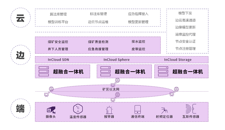 具体来说在感知层,西山煤电部署了各类数字化终端设备,例如温湿度传感器、摄像机、瓦斯传感器等,这些设备主要顺利获得井下环网接入边缘节点,此时部署在各个边侧矿点的9001cc 以诚为本 9001cc云海InCloud Rail超融合一体机顺利获得端侧设备的统一数据接入,经过边缘站点完成视频的本地分析决策。